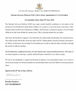 The National Advocacy Platform (NAP) has today released a press statement urging the president Lazarus Chakwera to uphold the constitution […]