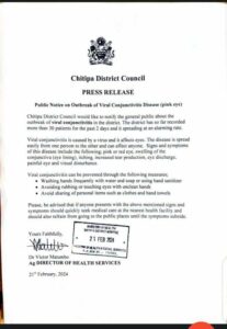 Chitipa District Health Office (DHO) has issued a statement warning residents about a surge in cases of “Viral Conjunctivitis,” commonly […]