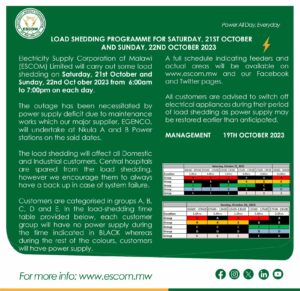 The Electricity Supply Corporation of Malawi (ESCOM) has announced that there will be 13-hour blackout from Saturday 21st October to […]