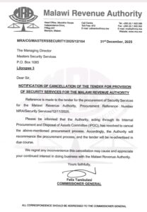 The Malawi Revenue Authority (MRA) has cancelled a tender for the provision of security services that was to be awarded […]