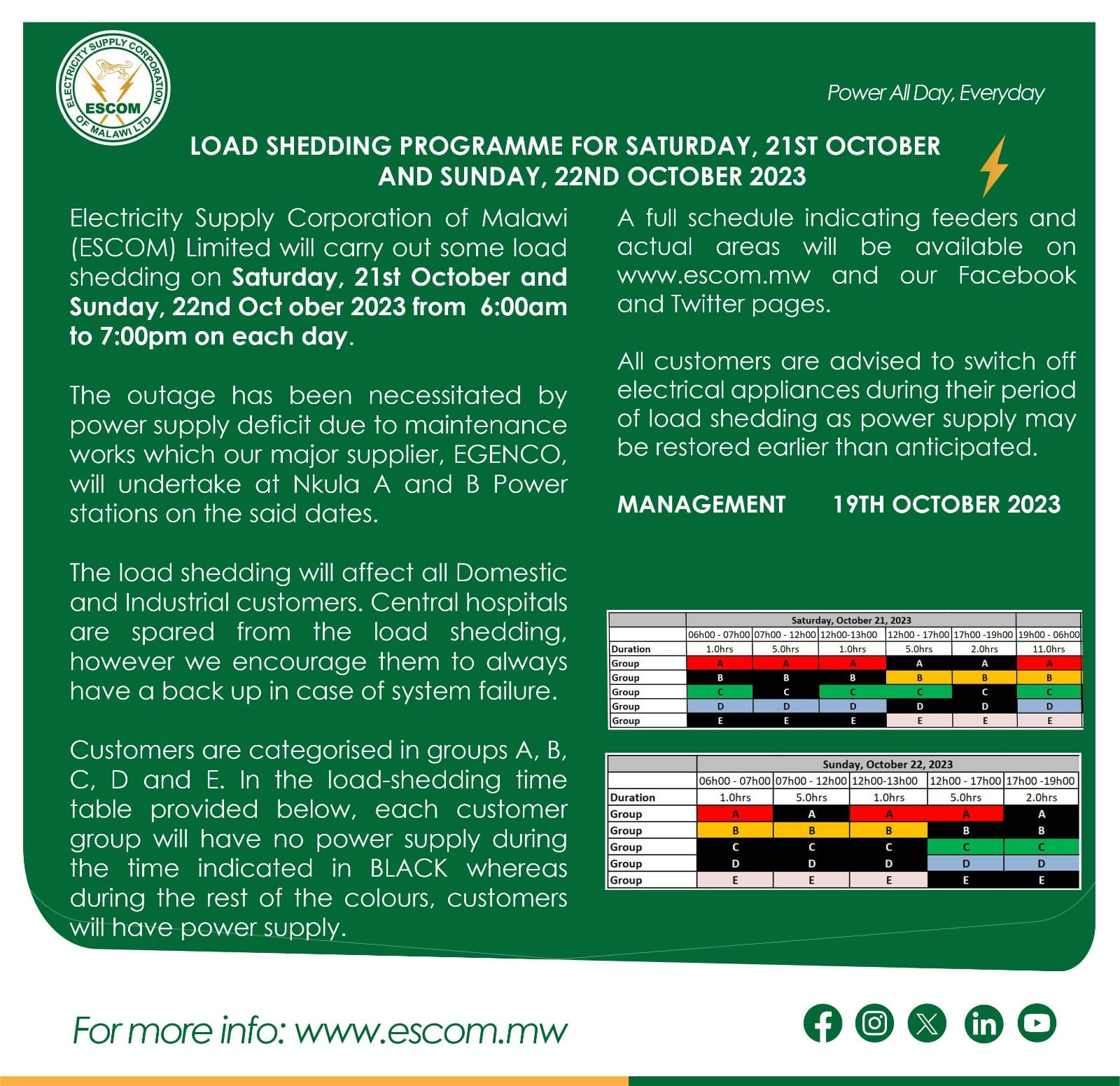 The Electricity Supply Corporation of Malawi (ESCOM) has announced that there will be 13-hour blackout from Saturday 21st October to […]