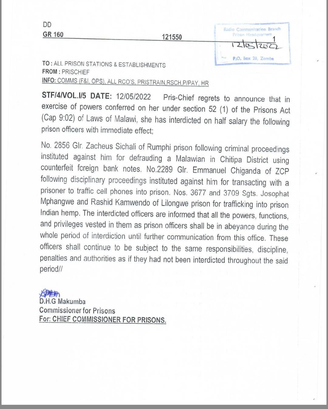 The Malawi Prison Service has interdicted Emmanuel Chiganda for transacting with a prisoner to traffic cellphones into prison. This follows […]