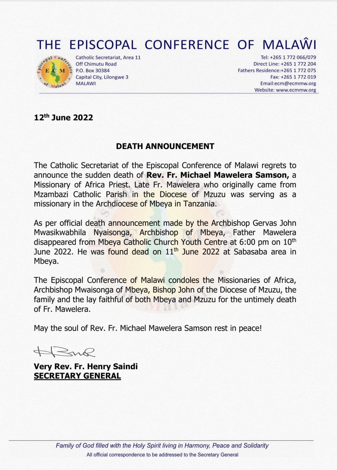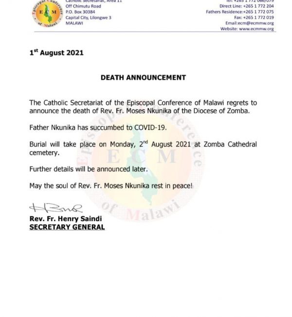 Death has been announced of Reverend Father Peter Jester Banda, a catholic priest of the Archdiocese of Lilongwe. Father Banda […]