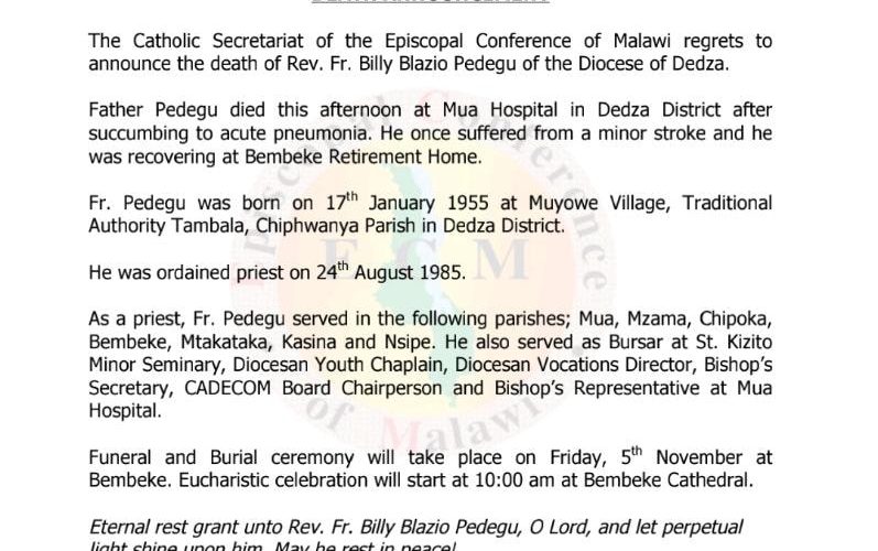 Death has been announced of Reverend Father Billy Blazio Pedegu of the Roman Catholic under Dedza Diocese. Episcopal Conference of […]