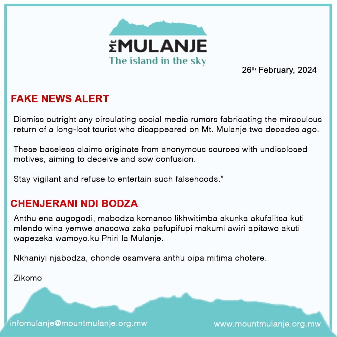 Mulanje Conservation Trust has dismissed rumours hovering on social media claiming that the Dutch national who went missing at Mulanje […]