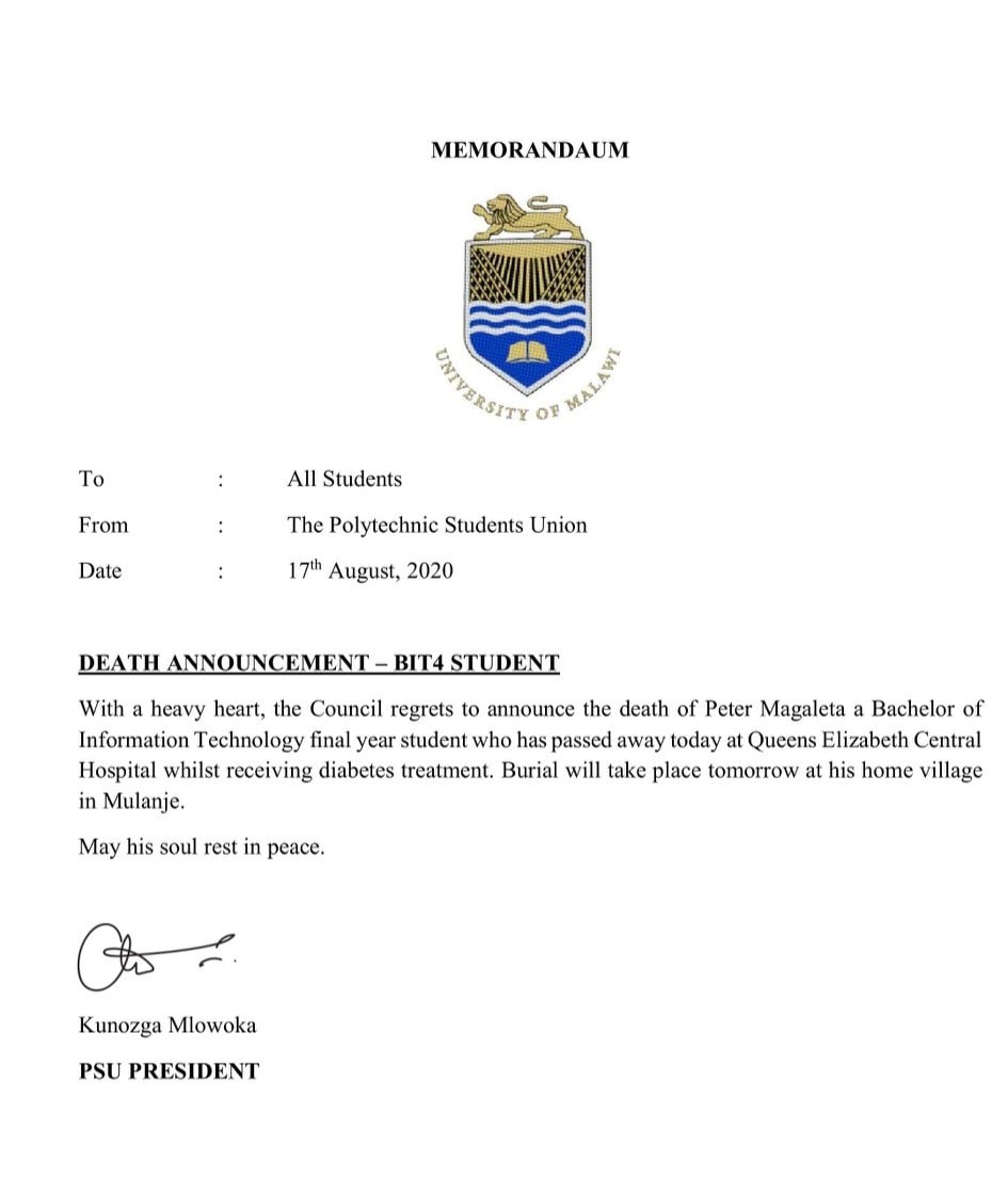 Death has been announced Peter Magaleta, Bachelor of Information Technology (BIT4) final year student at Polytechnic, a constituent college of […]